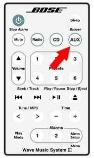 Note: The Wave® music system remote control cannot turn a connected AUX device on or off, or change its settings or selections. Neither AUX 1 or AUX 2 can be selected as an alarm source.