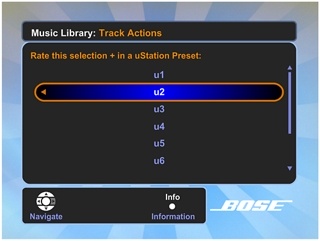 首次选择 uStation 时,它需要知道您的个人喜好。此时将从整个存储的音乐选集中播放音乐,没有任何选择。您可以使用遥控器上的评分按钮来个性化定制您的音乐品味。