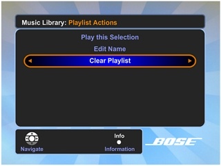 突出显示 CLEAR PLAYLIST(清除播放列表),然后按向右箭头。确认请求将出现在屏幕上。选择 YES(是)或 NO(否),然后按 ENTER(确定)。这会使您返回到上一个屏幕。