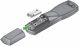 遥控器需要两节 AA 电池(随附)。电池位于遥控器背面的电池盒中。要放入电池: