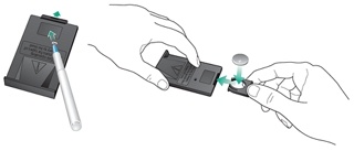 Insert the tip of a ball point pen in the left side of the security lock. Push to the right and hold