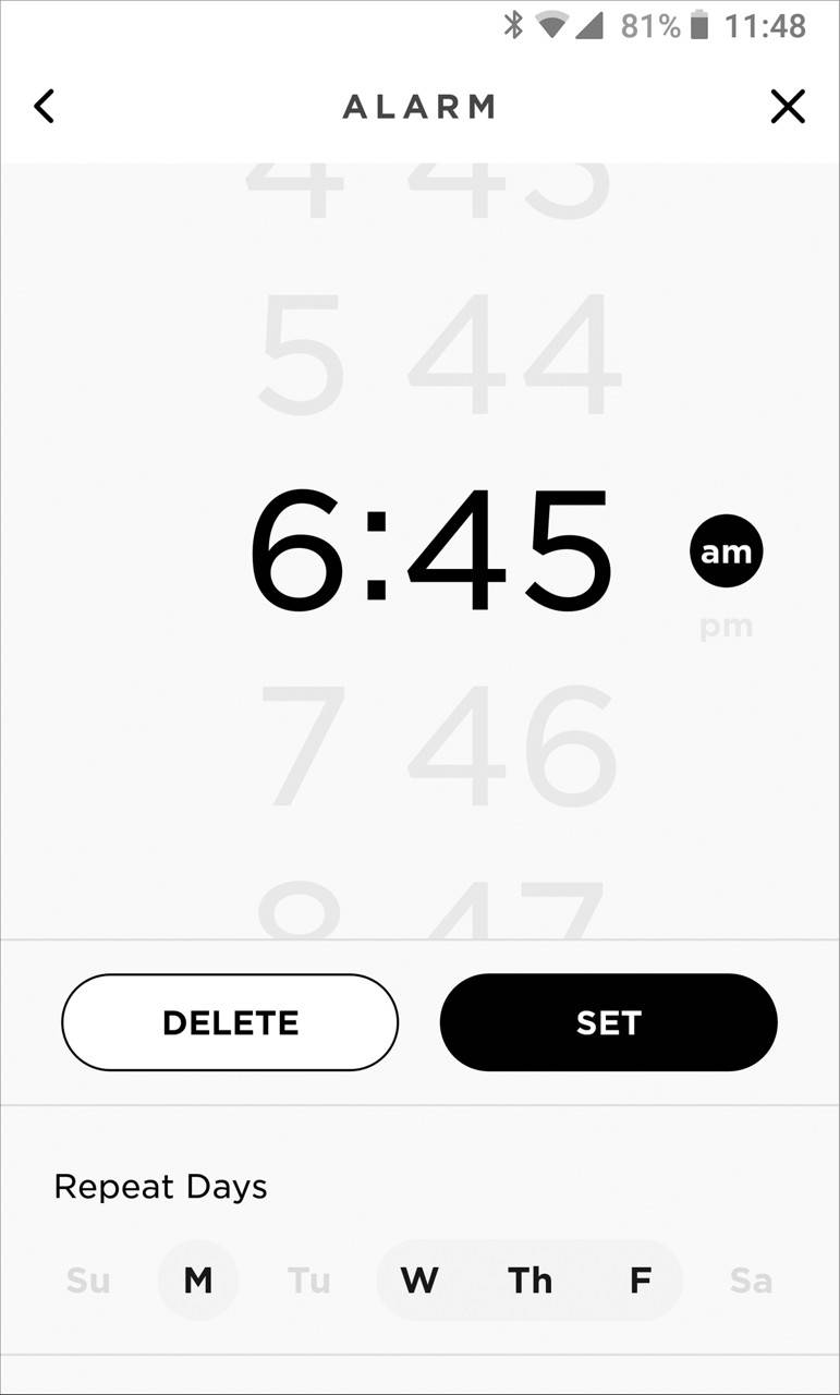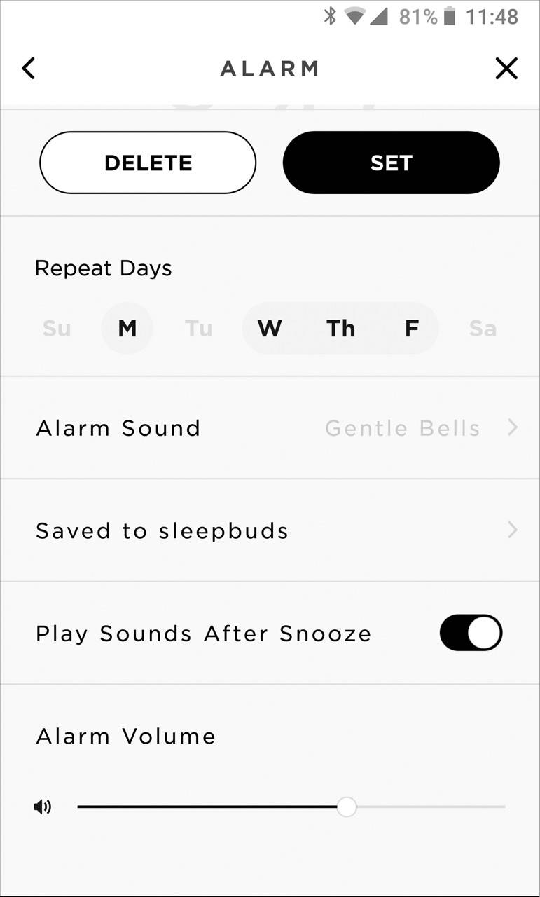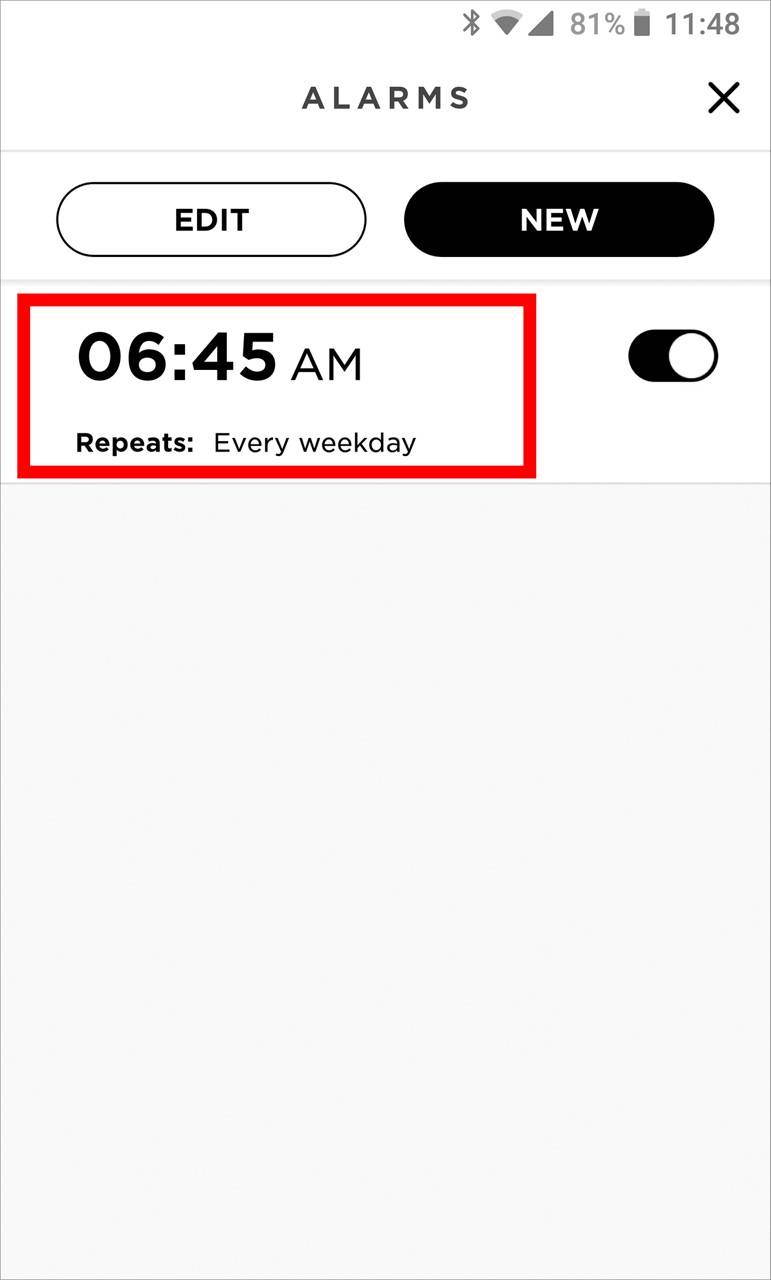 连接睡眠耳塞后,点击主页上的“Set Alarm”(设置闹钟)。您可以在此处打开或关闭闹钟,编辑已有闹钟并添加新闹钟。点击“EDIT”(编辑)按钮,选择多个闹钟。点击单个闹钟,编辑其时间和重复天数。