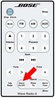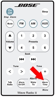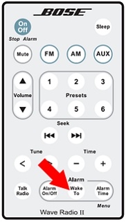 按住 WAKE TO(唤醒)按钮,直至听到两声哔哔声。闹铃现已设置为由您所选的广播电台唤醒