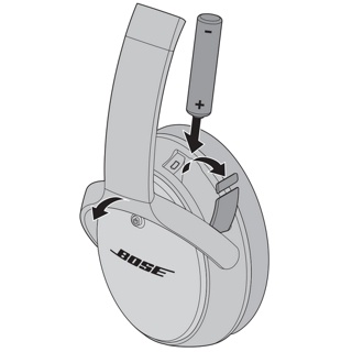从右侧耳罩撬开头带并打开电池舱。将 AAA 碱性电池插入电池舱