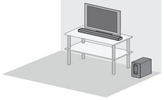 将 Acoustimass 低音箱的橡胶垫着地,沿电视所在的墙面放置,或沿房间前三分之一部分的其他任何墙面放置。低音箱的前开口可朝向任何方向。确保附近有交流电源插座