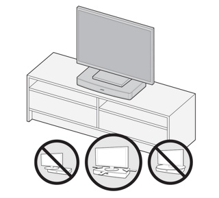 如果您正在将音响系统用作电视支架,请将电视放在该音响系统上,并确保电视机底座位于中间位置,而不是将其悬挂在该系统的任意边缘上