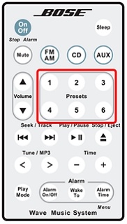 按下遥控器上的 ON/OFF(开/关)或 FM/AM 按钮启动 Wave® 音乐系统,然后选择 FM 或 AM 作为音频源