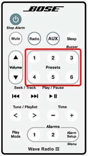 按住六个 presets(预设)按钮中的一个,直至听到两声哔哔声。预设编号和电台频率将会出现在显示屏上