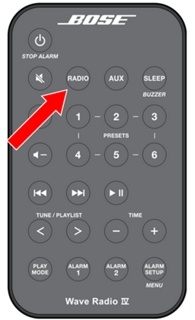 在遥控器上,按 RADIO(收音机)按钮可打开收音机。将会播放上次选择的无线电台。在系统开启时按 RADIO(收音机)按钮可以在 FM 和 AM 之间切换。