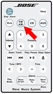 在遥控器上,按下 FM/AM 按钮可打开收音机收听上次选择的 FM 或 AM 电台。再次按下 FM/AM 可在 FM 和 AM 之间切换。